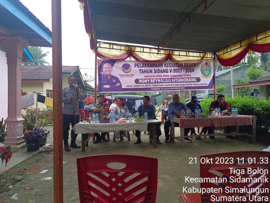 Anggota DPRD Provinsi Sumatera Utara, Rony Reynaldo Situmorang dari Partai Nasdem, melaksanakan kegiatan reses di Dusun I Nagori Manik Hataran, Kecamatan Sidamanik, Kabupaten Simalungun. Acara tersebut berlangsung mulai pukul 10.00 WIB hingga selesai.