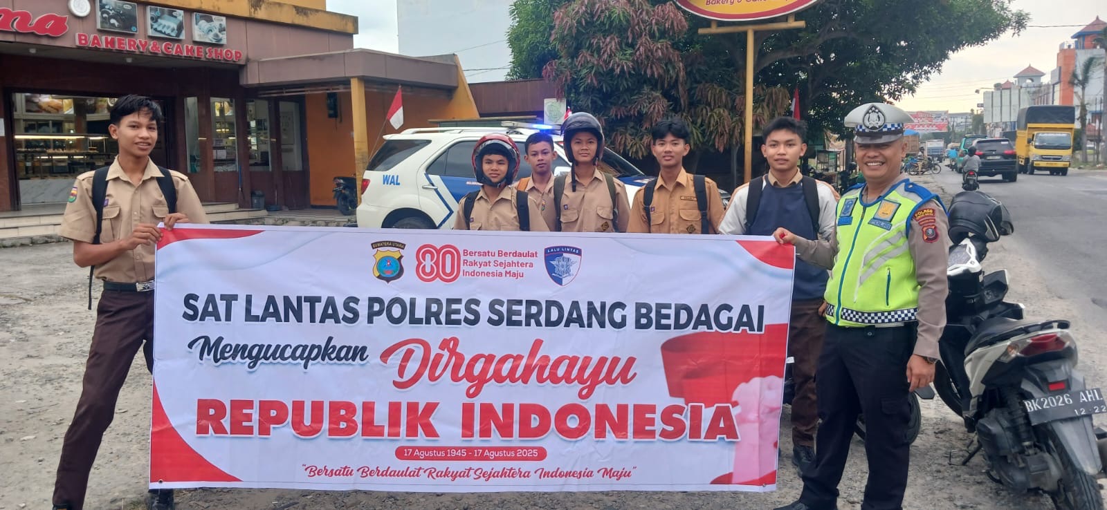 SERGAI,KINCIRnews.com || Pada hari Jumat, 08 Agustus 2025, Sat lantas polres serdang bedagai Melaksanakan Giat dengan tajuk “Polantas Menyapa”Membagikan Bendera Kepada Masyarakat dan Pengemudi dalam Rangka HUT ke-80 Republik Indonesia, sekaligus Memberikan Arahan tentang bagaimana Berkendara Dengan Aman dan Baik