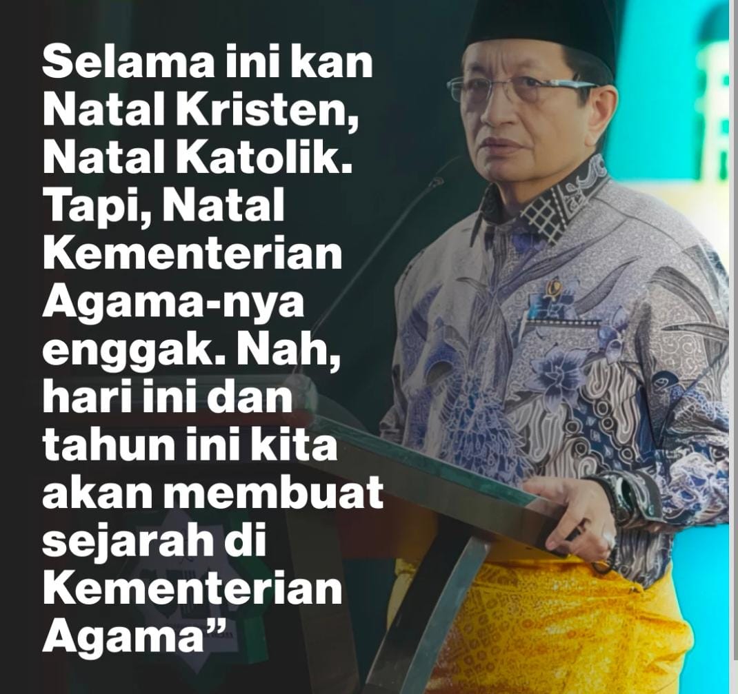 “Selama ini kan Natal Kristen, Natal Katolik. Tapi, Natal Kementerian Agama-nya enggak. Nah, hari ini dan tahun ini kita akan membuat sejarah di Kementerian Agama,” ujar Nasaruddin Umar dalam acara Jalan Sehat Lintas Agama di Kantor Kemenag, Jakarta.