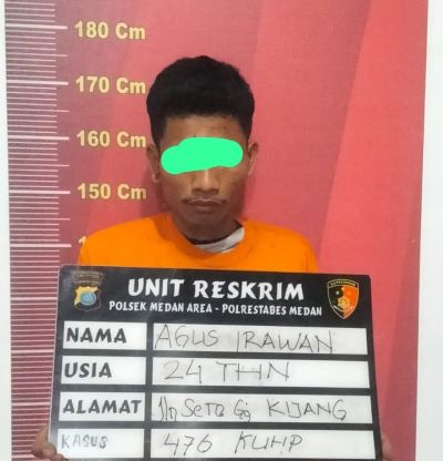 Tersangka adalah, Agus Irawan (24), warga Jalan Seto Gang Kijang Kelurahan Tegal Sari II Kecamatan Medan Area. Sedangkan pelapornya adalah, Hariz Luthfi (53), warga JaIan, Ujung Serdang Kecamatan Tanjung Morawa Kabupaten Deli Serdang.